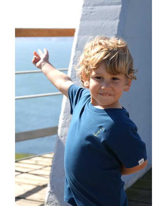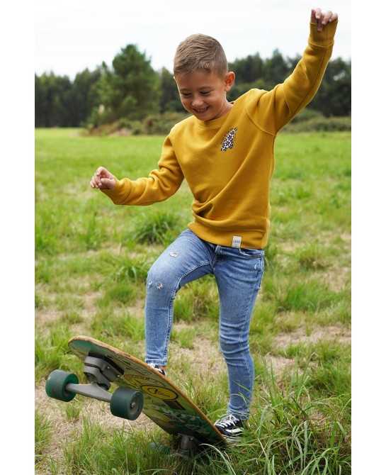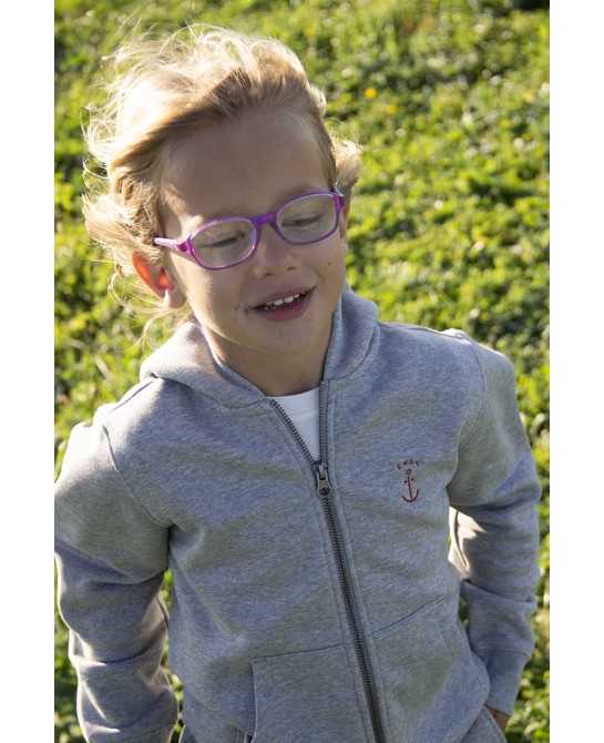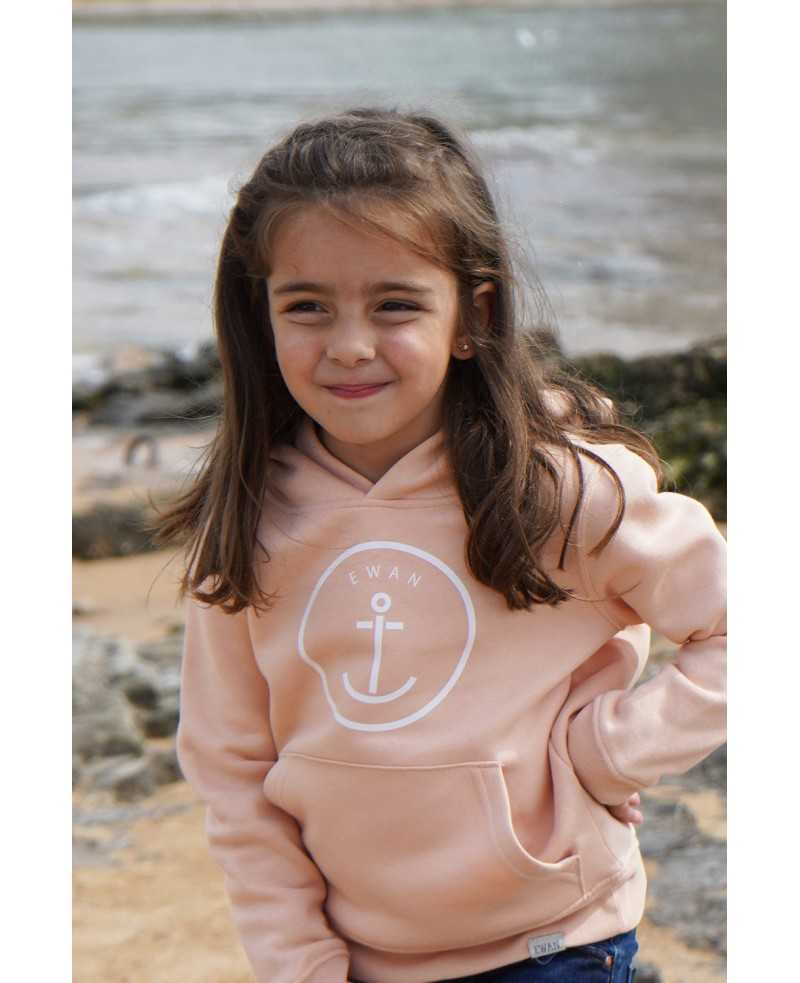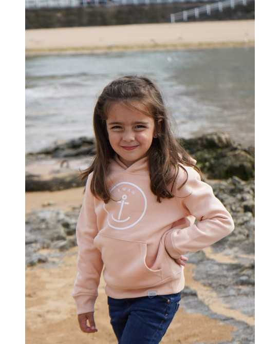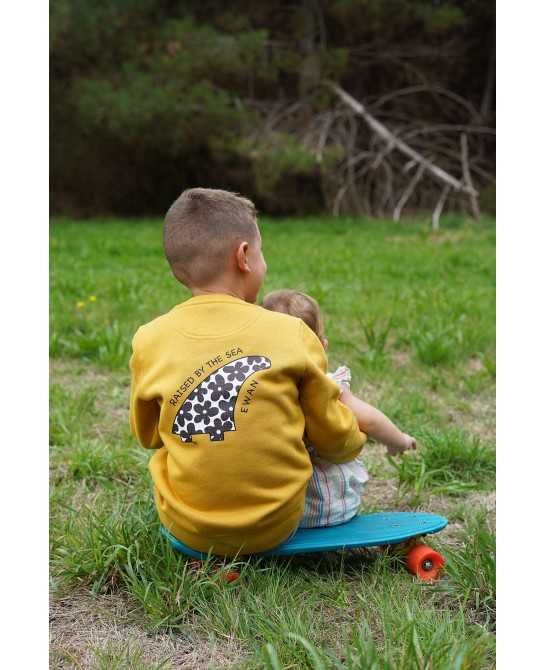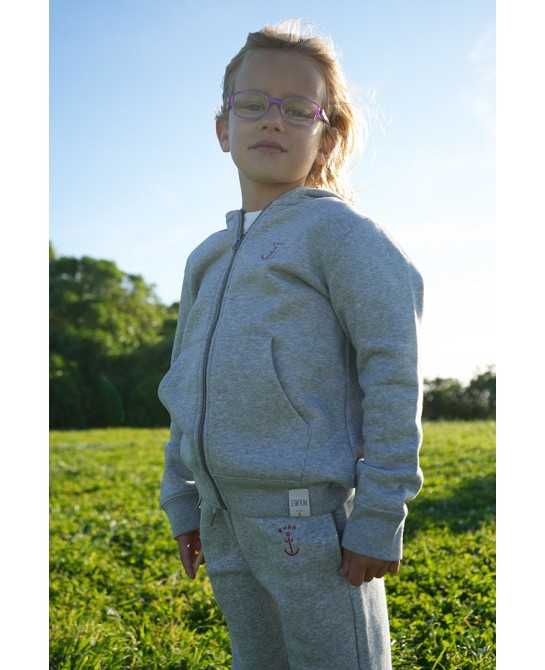 Fabricada en felpa perchada, 85% algodón orgánico hilado y peinado, y 15% poliéster reciclado.