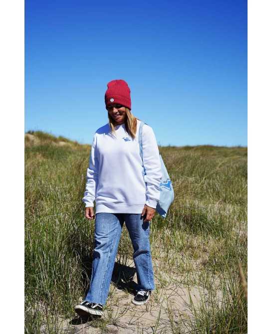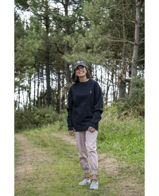 Fabricada en felpa perchada, 85% algodón orgánico hilado y peinado, y 15% poliéster reciclado. Certificaciones: Fair Wear, PETA Approved Vegan, Oeko-Tex, GOTS Te recomendamos lavarla con colores similares dándole la vuelta, no planchar el estampado e incluso plancharla al revés para que se conserve perfecta durante más tiempo.