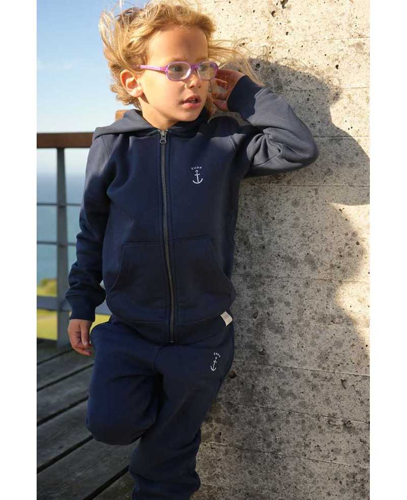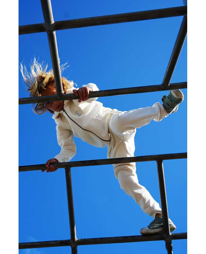 Composición: 85% algodón orgánico y 15% poliéster reciclado postconsumo. Lavado con enzimas. Felpa perchada. 2 botellas recicladas.
