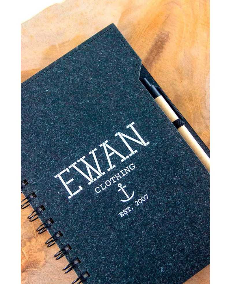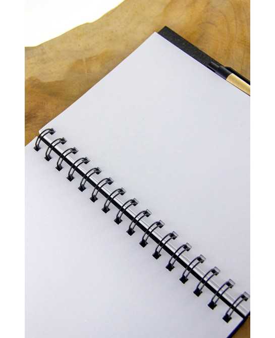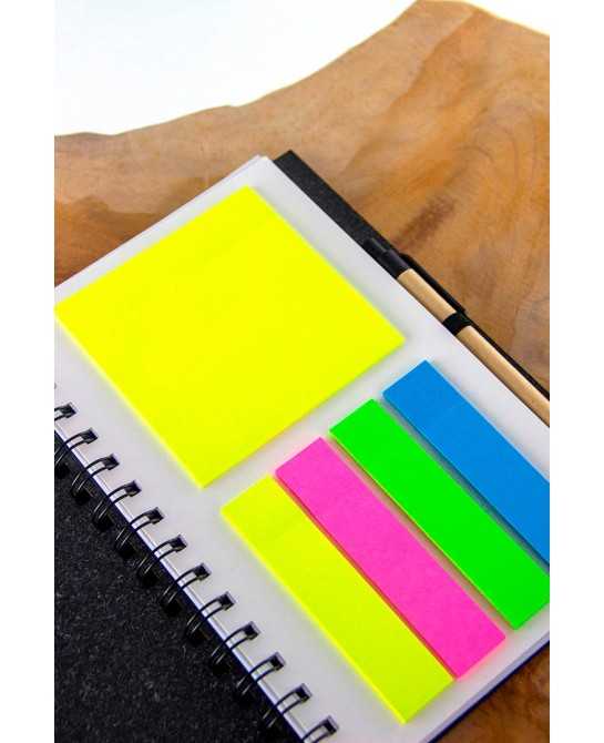 Libreta de cartón reciclado con hojas lisas. Incluye marcapáginas adhesivos de colores, posits y bolígrafo.