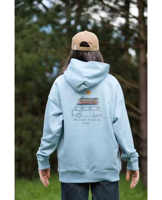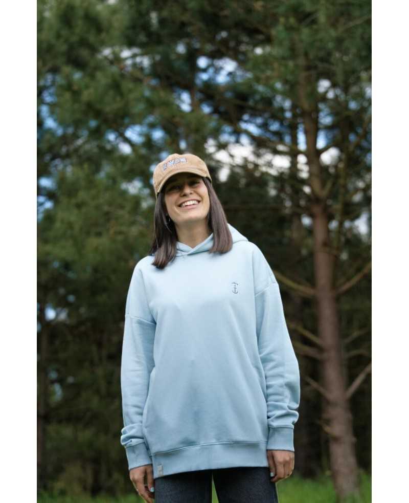 Composición: 85% algodón orgánico y peinado Ringspun y 15% poliéster reciclado postconsumo. Felpa perchada. Lavado con enzimas. 6 botellas recicladas. 300g.