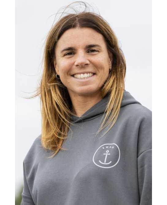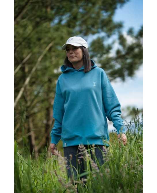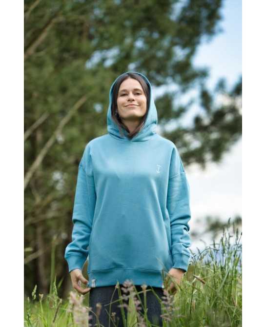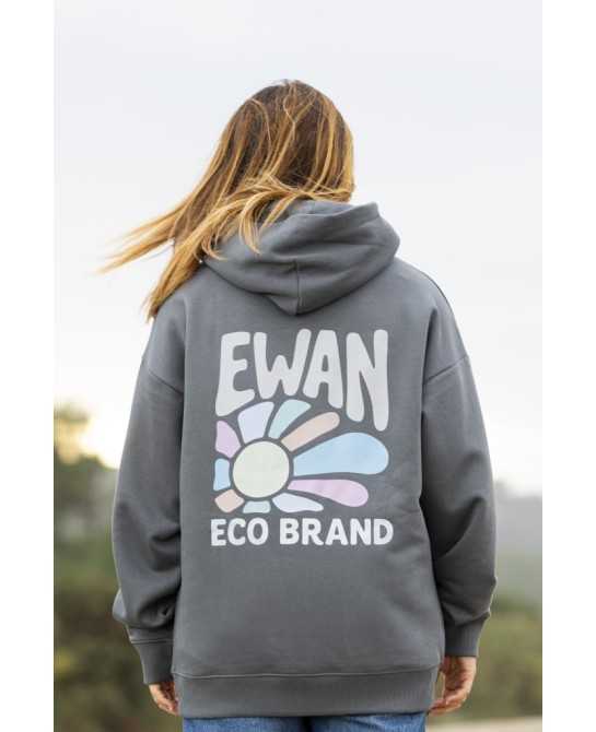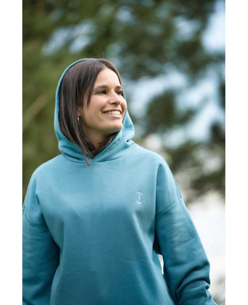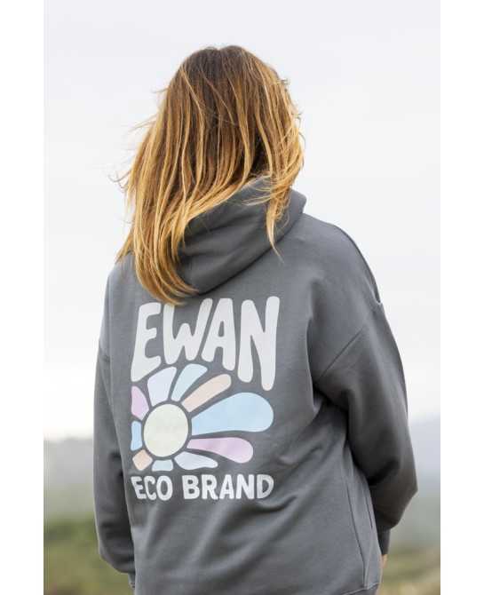 Composición: 85% algodón orgánico y peinado Ringspun y 15% poliéster reciclado postconsumo. Felpa perchada. Lavado con enzimas. 6 botellas recicladas. 300g.