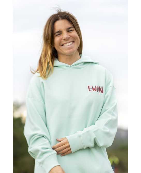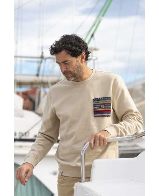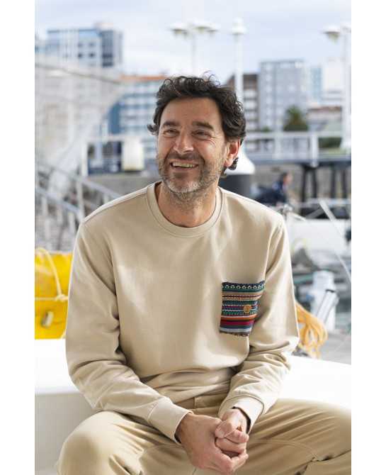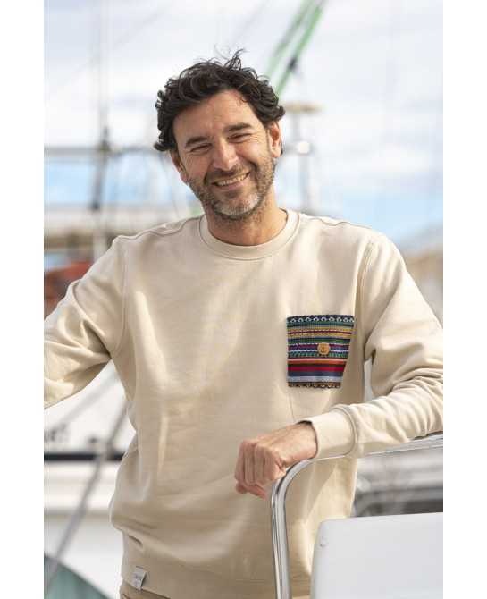 Composición: 85% algodón orgánico y peinado Ringspun y 15% poliéster reciclado postconsumo. Felpa perchada. Lavado con enzimas. 6 botellas recicladas. 300g.