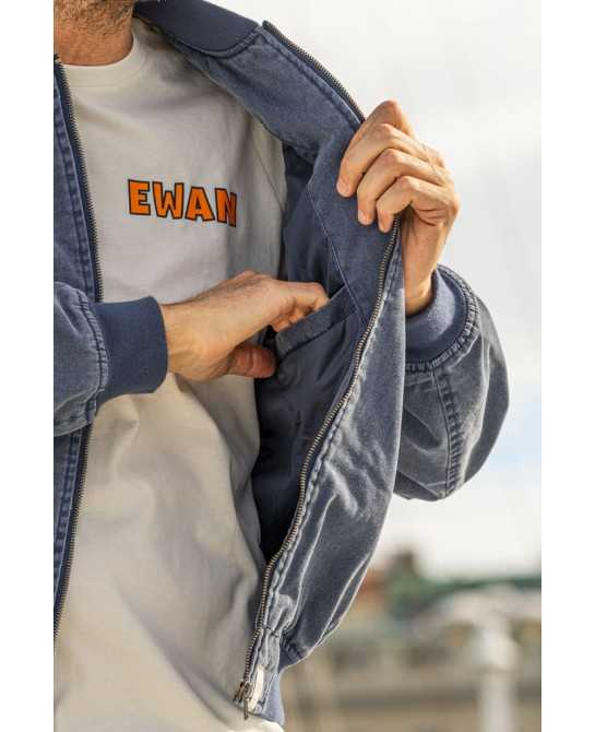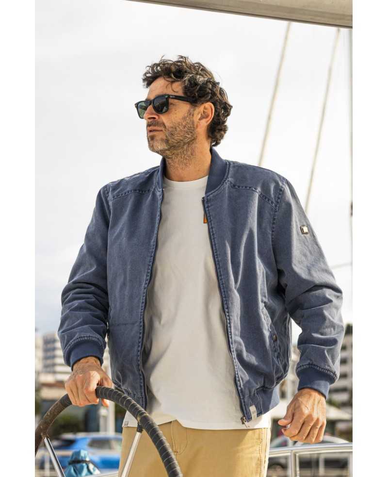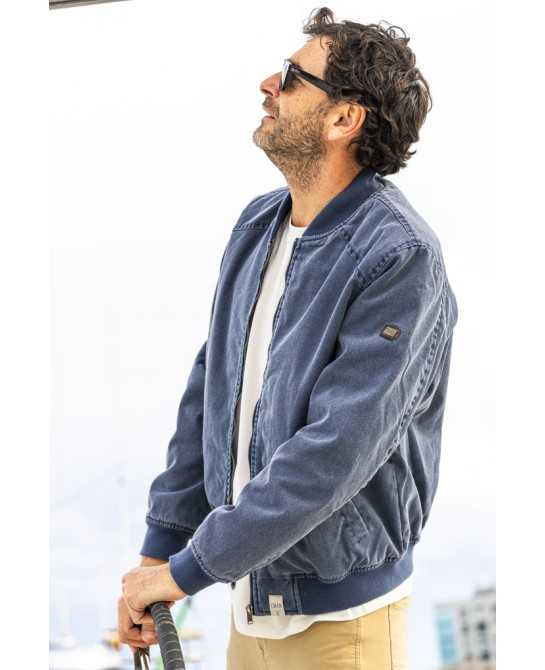 Chaqueta estilo bomber con efecto denim. Cuello y mangas acabadas en rib elástico y cierre de cremallera. Detalle de bolsillo interior.